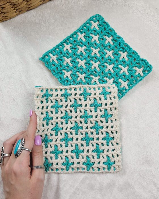 In terms of results, compared to mosaic crochet, interlocking crochet has the advantage that the fabric created is reversible. Flip the fabric over and it will either look the same as the front, or it will form an entirely different geometric design!