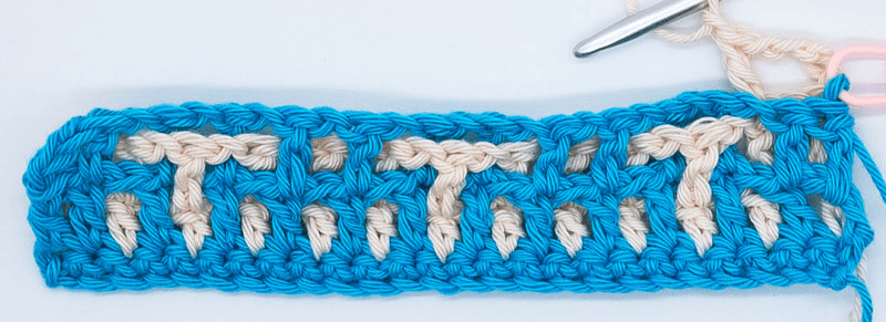 Other times, you’ll have to insert your hook through (underneath) this CH-sp in order to reach the DC from 2 rows below: