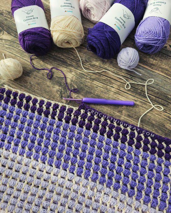 Hobbii Friends 8/4 (100% Cotton; 175 yds/160 m per 1.75 oz/50 g ball) in color Oatmilk (03) as the main color and Faint Purple (66), Misty Violet (67), Lavender (73), Purple Rain (70), and Black Currant (71) as the contrast colors.