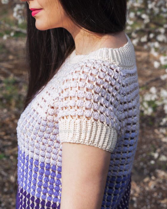 Featuring short sleeves and a ribbed hem, collar, and cuffs, this lightweight design is as breezy to wear as it is to make. The ribbed collar features increases and decreases that are designed to raise the back of the neck in order to make the top have an improved fit around the neckline.