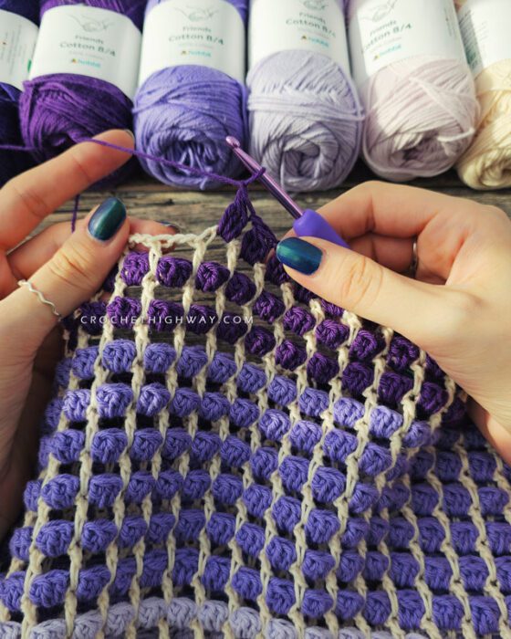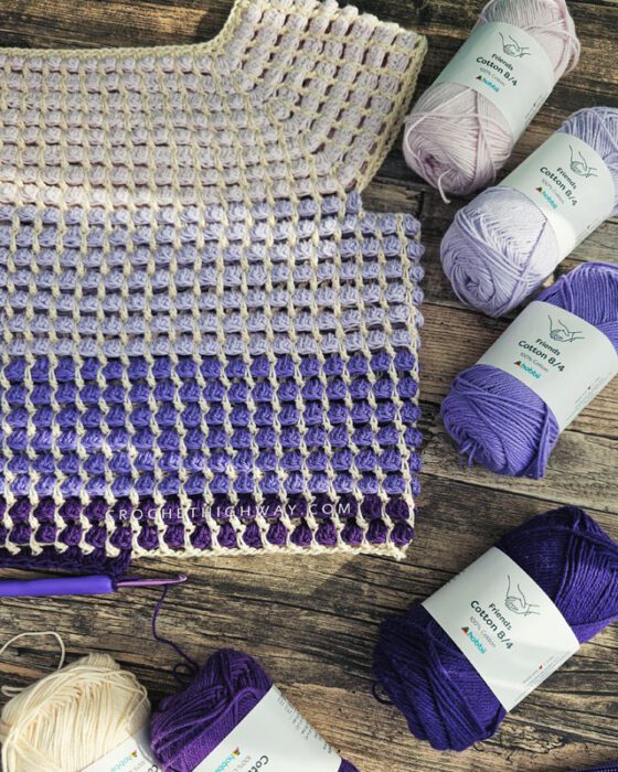 Size 1, using 290 yds of Ashley’s Crochet 12-Ply Fine Cotton In Cream as MC, and 580 yds of Ashley’s Crochet Premium Gradient In Butterfly Garden as CC