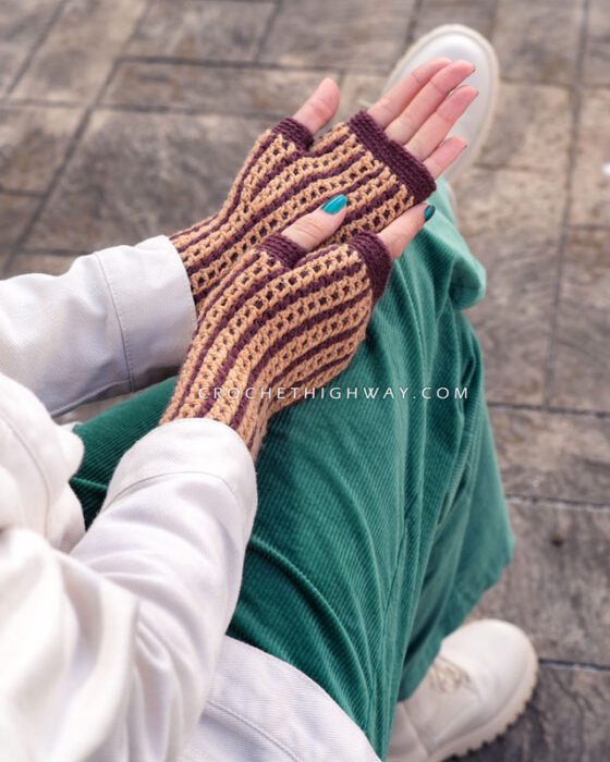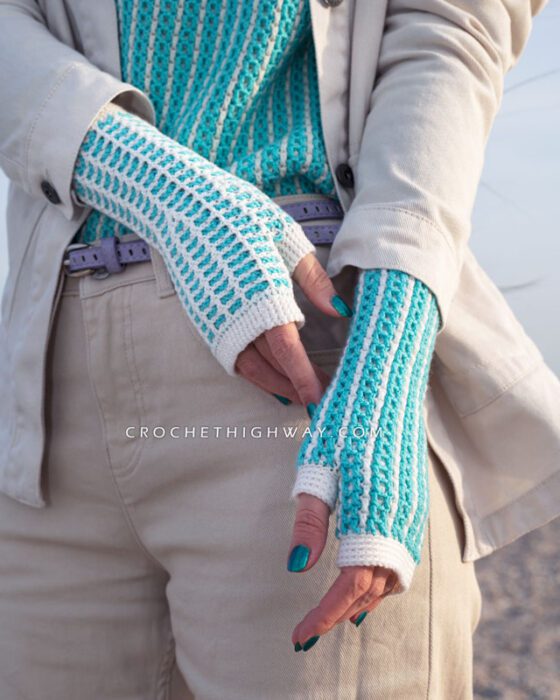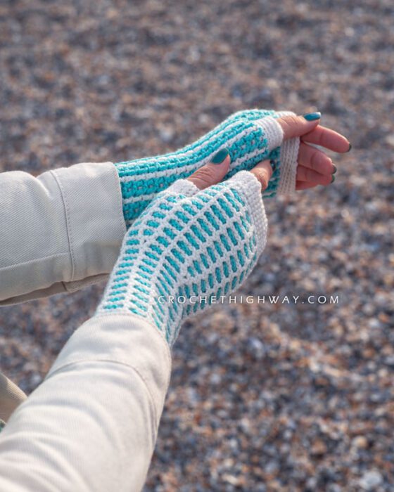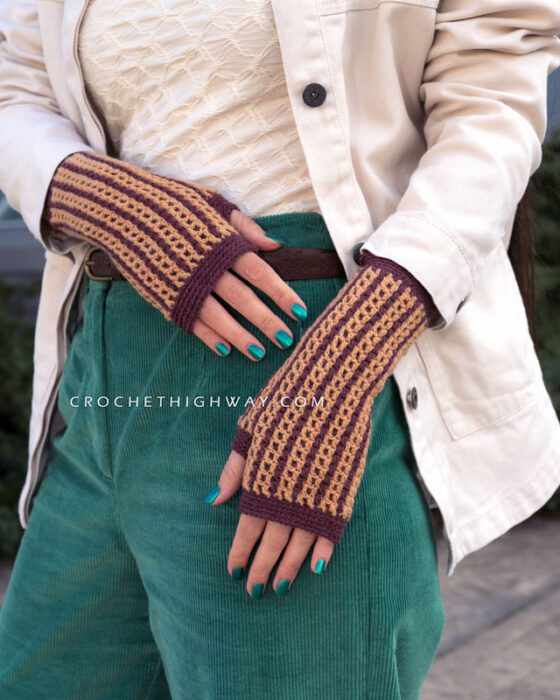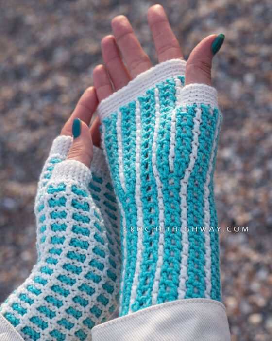 Featuring a reversible design that completely transforms when turned inside-out, these fingerless mittens showcase the beauty of the interlocking crochet technique.