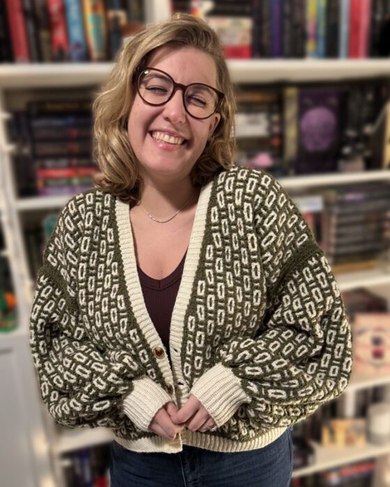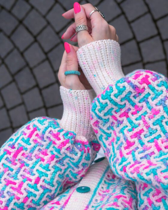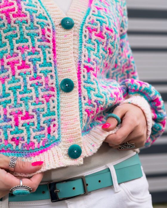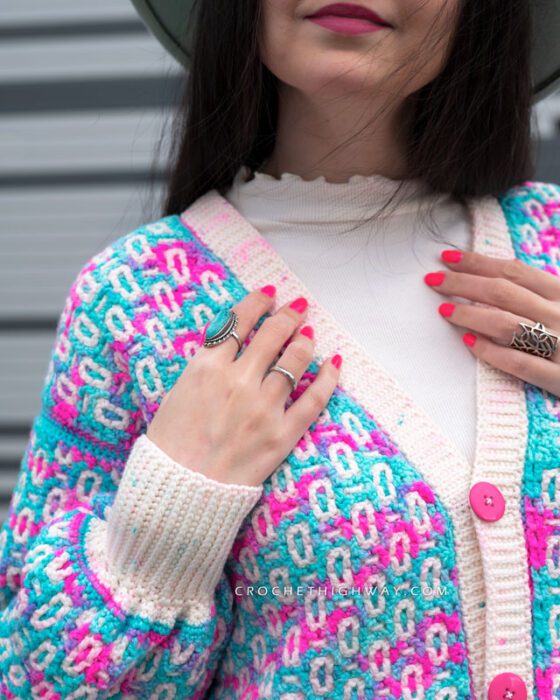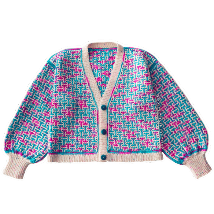 The Ones and Zeroes stitch is one of 50 reversible stitch patterns from my upcoming book, Interlocking Crochet, so think of this cardigan as your first look inside. The book arrives May 26, 2026, and pre-order links are waiting for you here!
