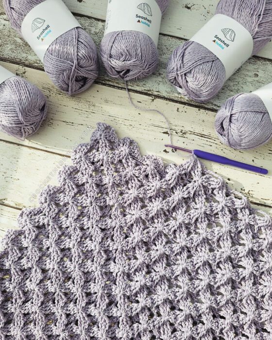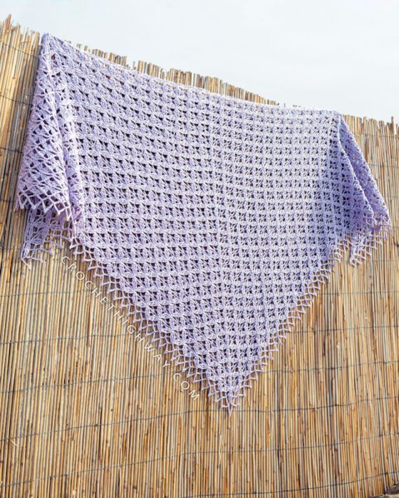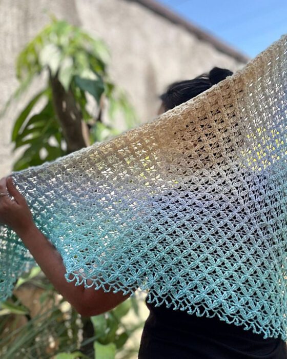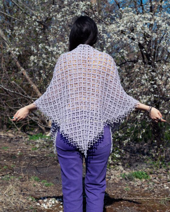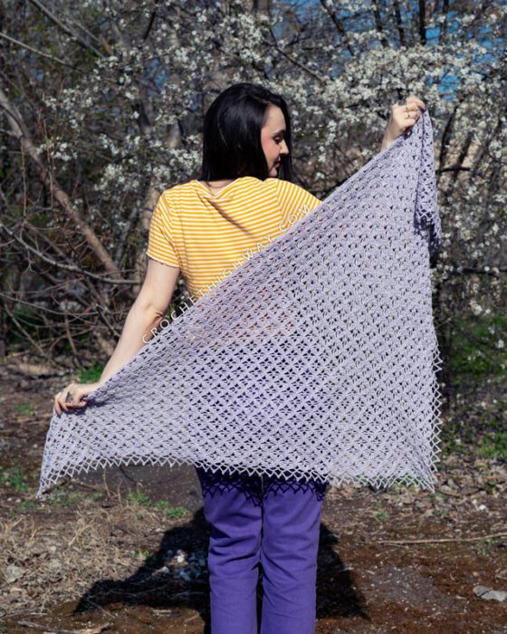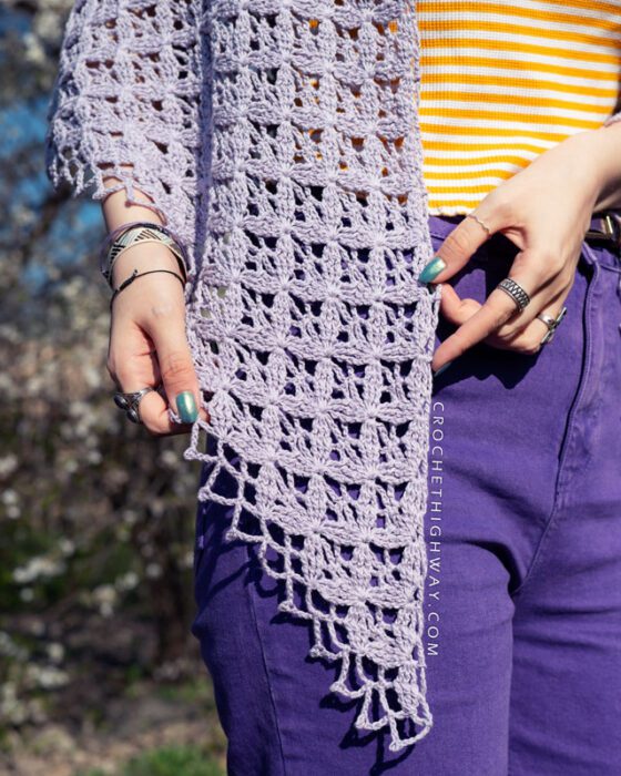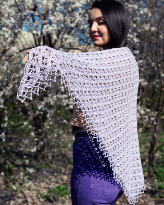 Light, airy, and full of detail, this shawl is the kind of accessory that feels like a celebration of spring. The main stitch pattern combines treble crochets and chain spaces in an easy-to-memorize two-row repeat that works up faster than you’d think. The fabric is open and lacey, yet surprisingly textured and three-dimensional. A delicate lace border finishes the edge for a polished, elegant touch.