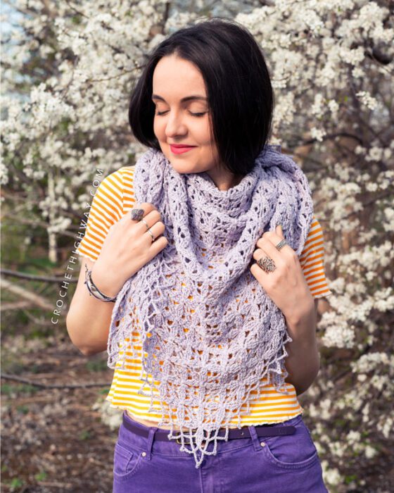 Meet the Purpureal Shawl, a delicate lace shawl named after the soft lavender colorway in which it was first crocheted.