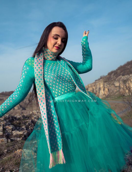 Mods: I shortened the front and back panels for one repetition or it would have been too long for my height and likes. I omitted 5 rows from the underarm panel for a tighter fit, consequently, I had to also reduce these rows from the sleeve underarms to match the width of the body underarms. The length of the sleeves was fine before ribbing, so instead of chaining 11 for the cuffs, I chained 7 only. Also, to reduce the cuff circumference, I alternated 2 SLST and then 3 SLST when making the ribbing.
